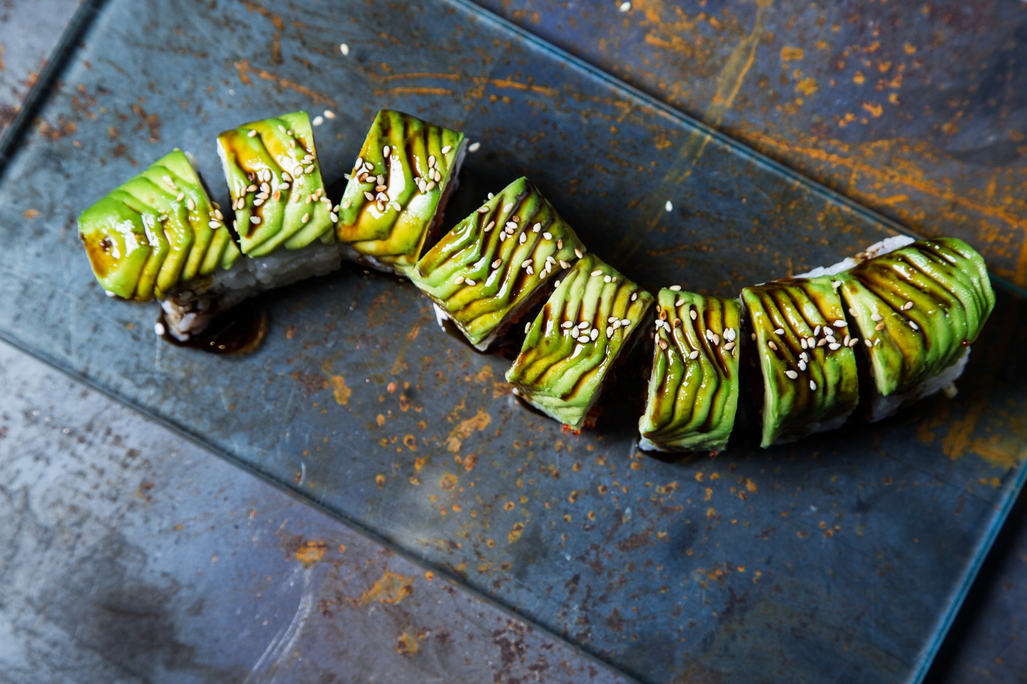 z pieczonym węgorzem, awokado, ogórkiem i sosem teriyaki -