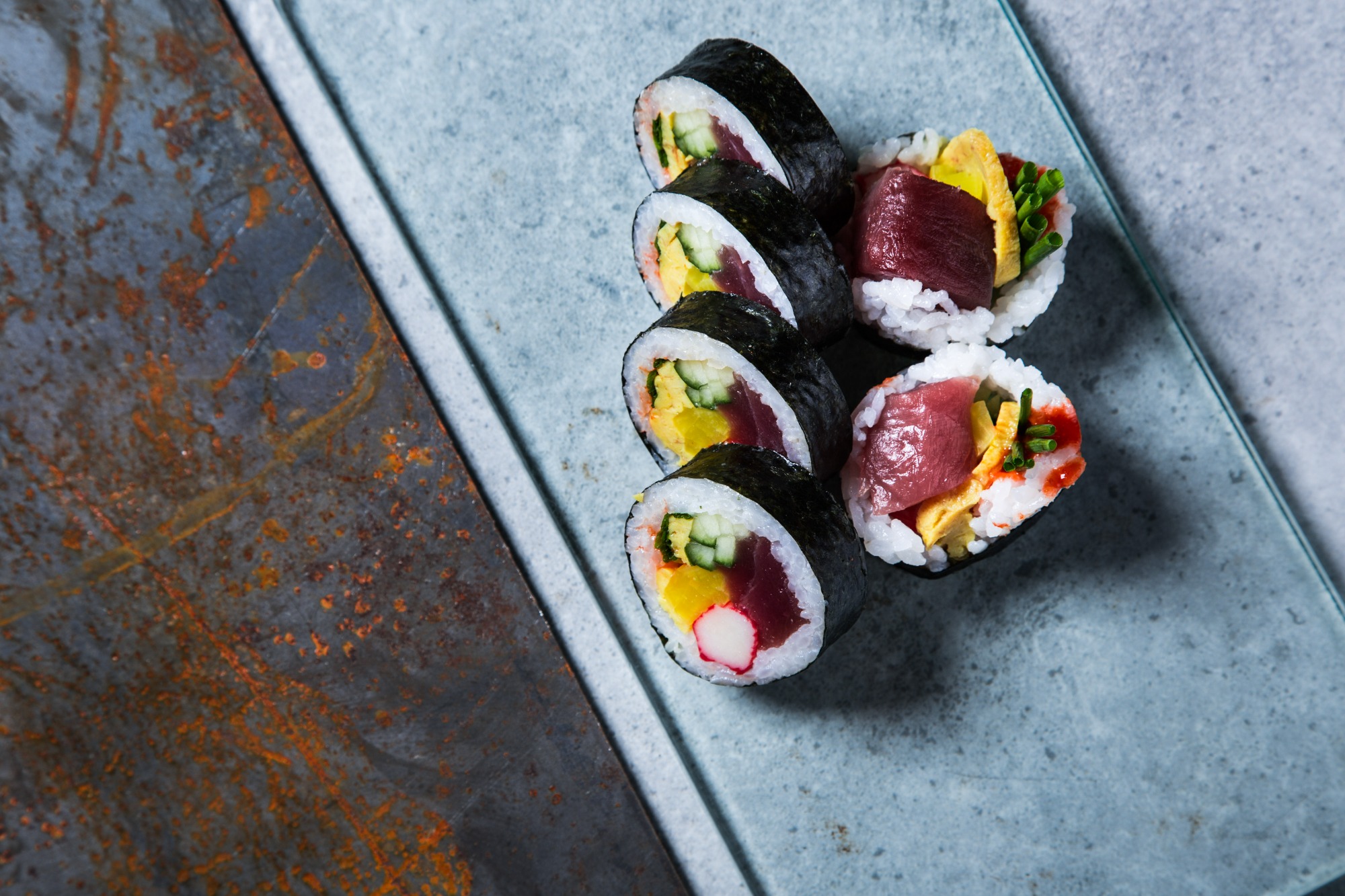 z grillowanym tuńczykiem, omletem tamago, awokado, ogórkiem i majonezem -